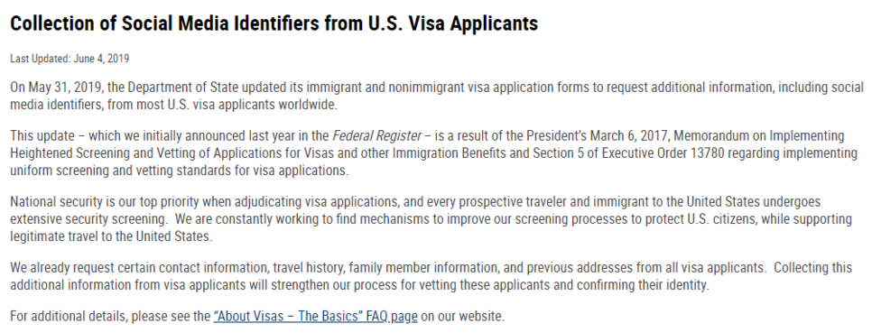 2019년 6월 4일 국무부에서 새롭게 업데이트 한 내용을 살펴보겠습니다. 이미 작년에 한 번 언급을 하기도 했던 이번 업데이트는 앞으로 비자를 신청하는 모든 이들에게 해당 정보 공개를 요청하겠다는 내용인데요, 아래 더 확대된 내용을 보겠습니다.