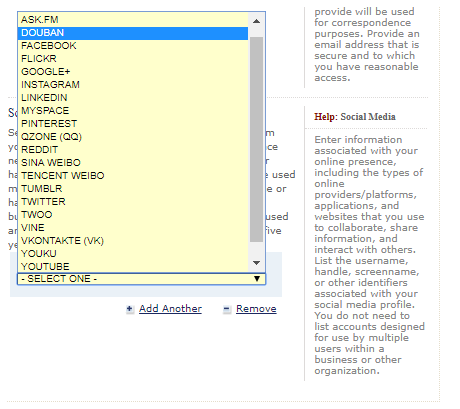 이 20가지의 SNS 중에 본인이 해당되는 것이 있다면 꼭 입력을 해주셔야 합니다. 특히 내가 최근 5년 동안 활동을 안한 곳이라고 하더라도 계정이 있을 경우엔 혹시 모를 경우에 대비하여 꼭 입력을 해 주시고 내가 모르는 사이에 계정의 해킹이나 다른 문제로 인하여 본인이 올리지 않은 게시물이 있을 수도 있으니 그 부분 또한 확인은 필수겠죠! 또한 해당 리스트에 없는 SNS 계정이 있을 경우 추가로 기재할 수 있는 공란도 추가되었습니다.