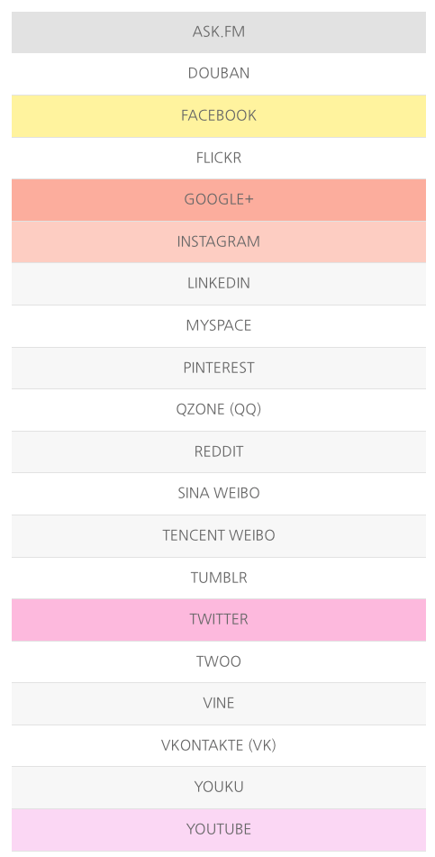 위 사진과 같이 여러 플랫폼을 선택할 수 있는 칸이 나오며 본인이 이용하고 있는 플랫폼을 클릭하게 되면 본인의 계정을 적을 수 있는 칸이 추가로 생성됩니다. 어떤 Social Media 들이 있는지 아래 표를 확인해 보시기 바랍니다.